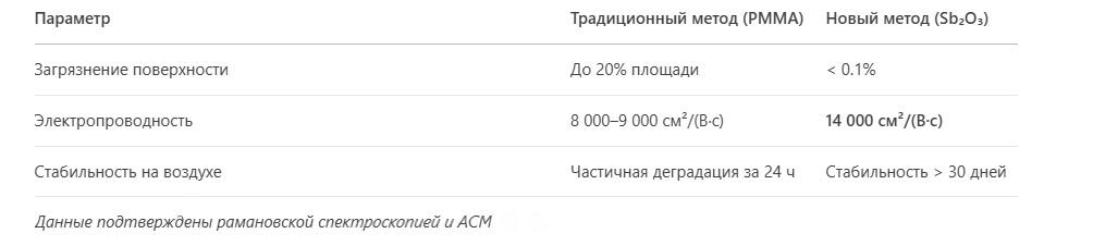 - Электропроводность сохранена на уровне 14 000 см²/(В·с) — близко к теоретическому максимуму для идеального графена (15 000 см²/(В·с)).